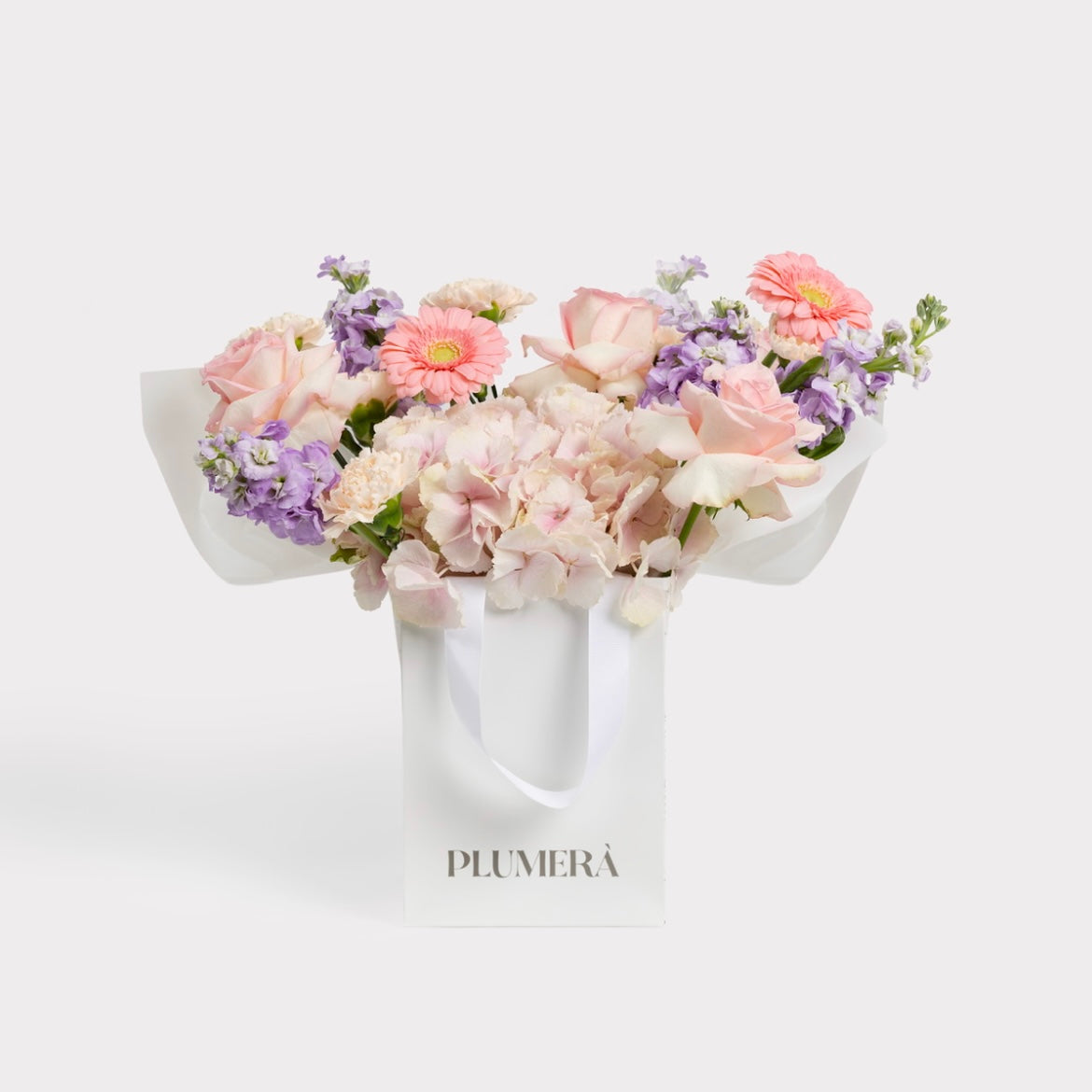 A blushing assortment of pink and purple hydrangea, mathiolla, roses and carnation.