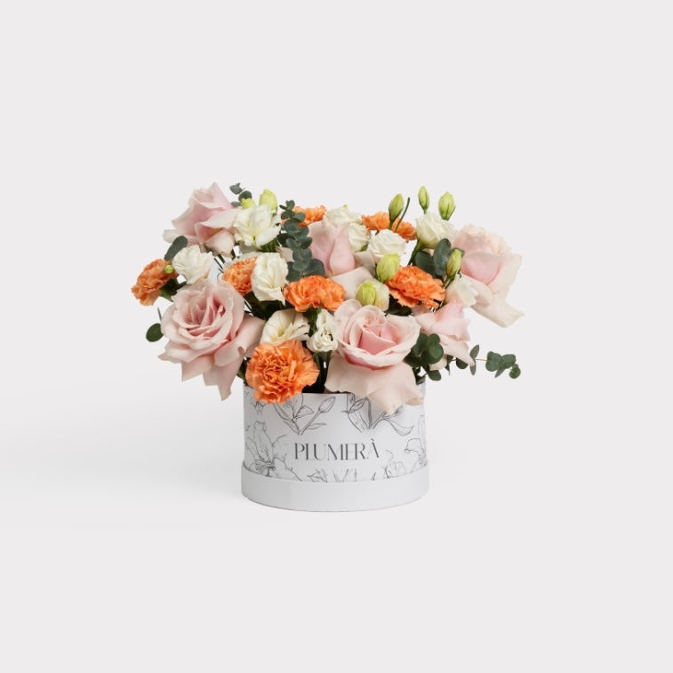 A mix arrangement of fresh roses, orange carnation and lisianthus.