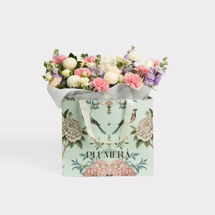 A mix of white, pink and purple arrangement of fresh roses, mathiolla, carnation and ping pong.